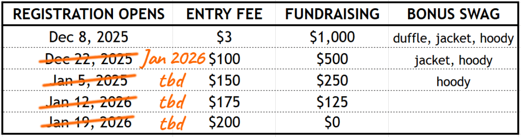 All entrants who raise $1,000 by March 31st will also get a CRM duffle bag, jacket, and hoody.