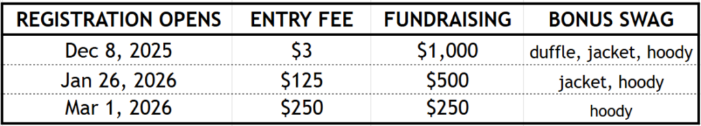 Due to the limited field size and growing popularity of this event, we will have a rolling registration process for 2026. Each fundraising level will remain open until our 200-runner field limit has been reached. All $1,000 & $500 fundraisers must raise at least $200 by March 1st. All fundraisers must reach their minimum goal by April 15th.